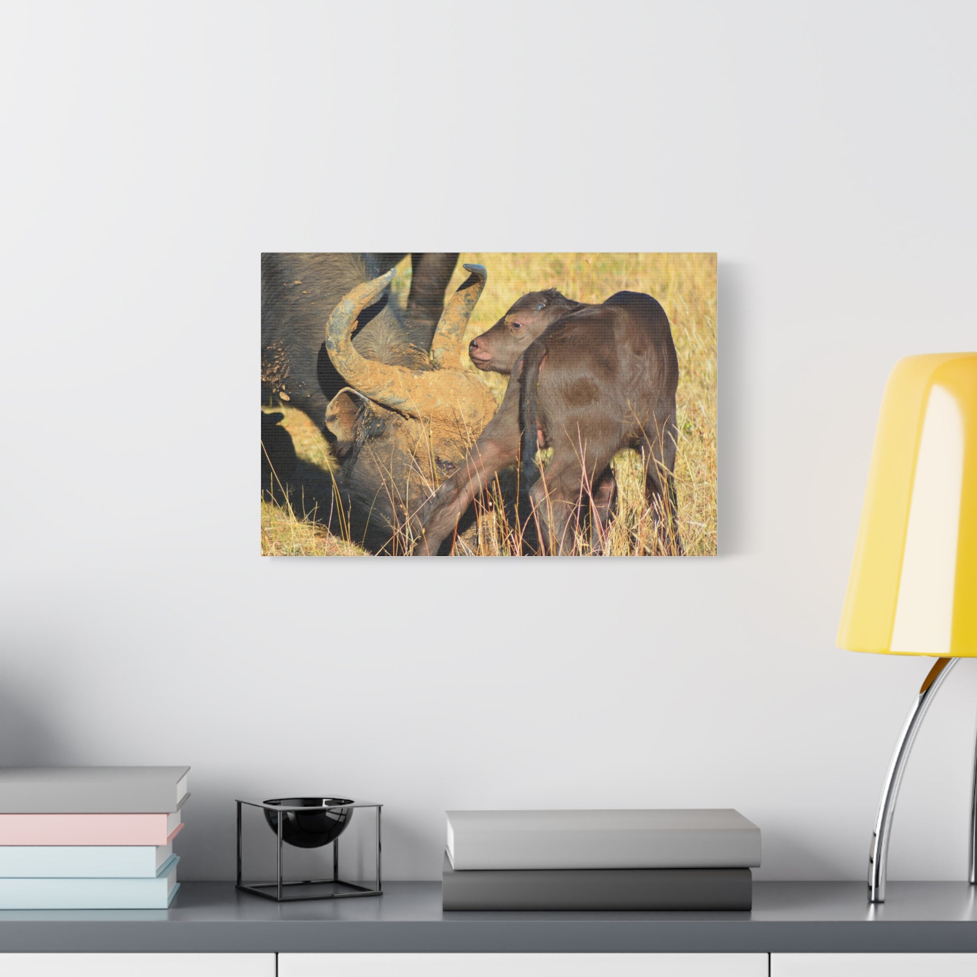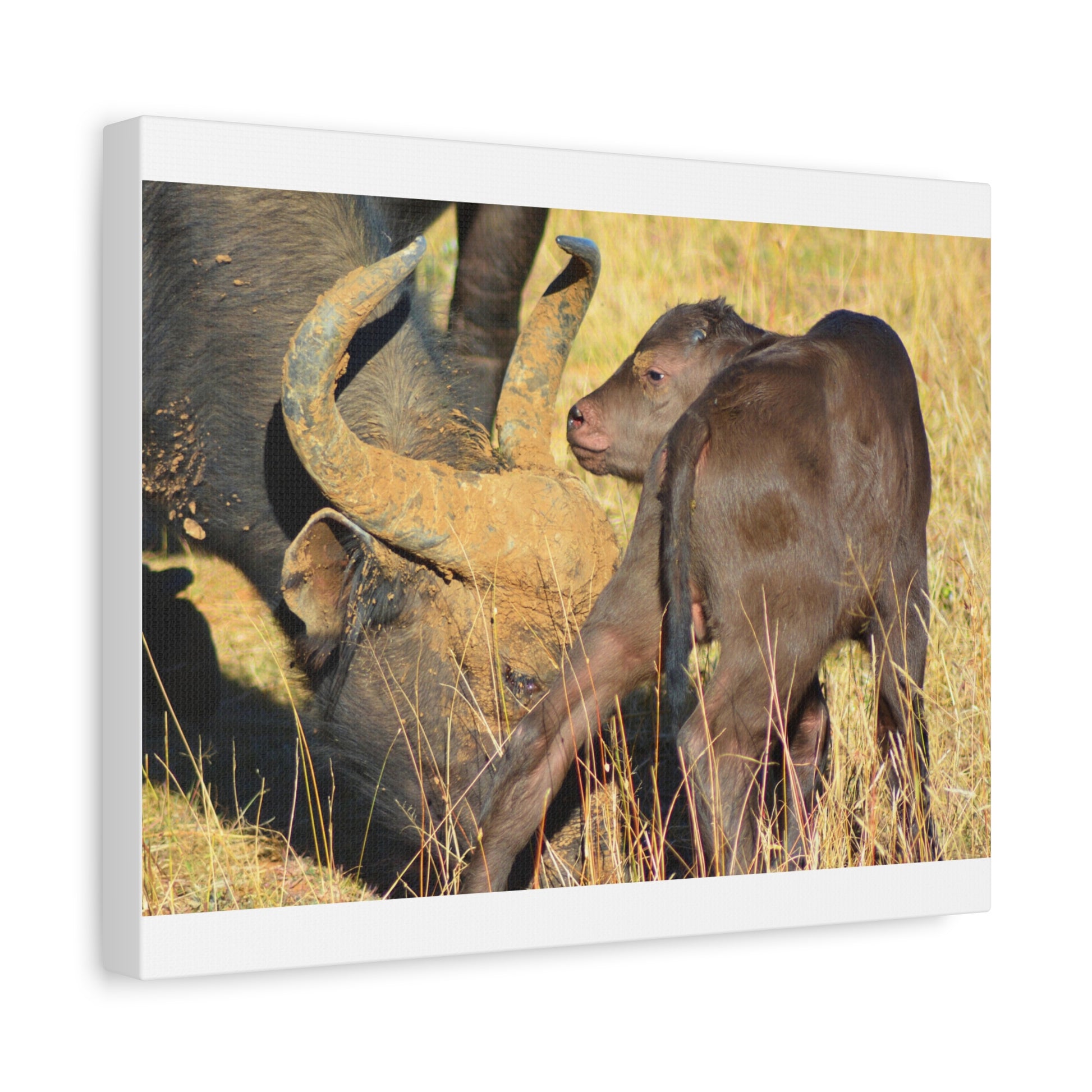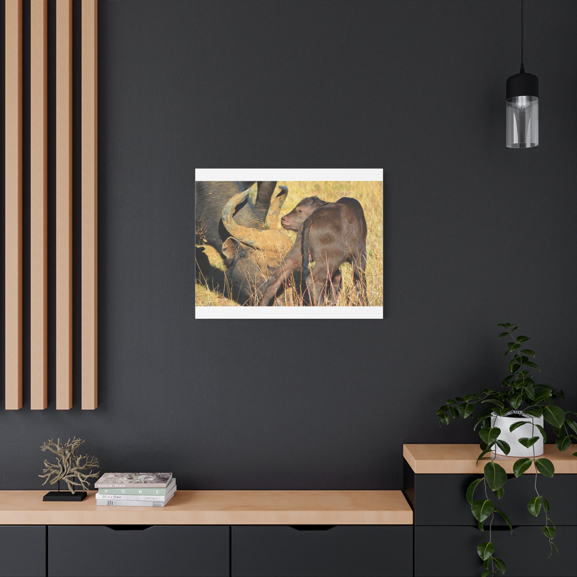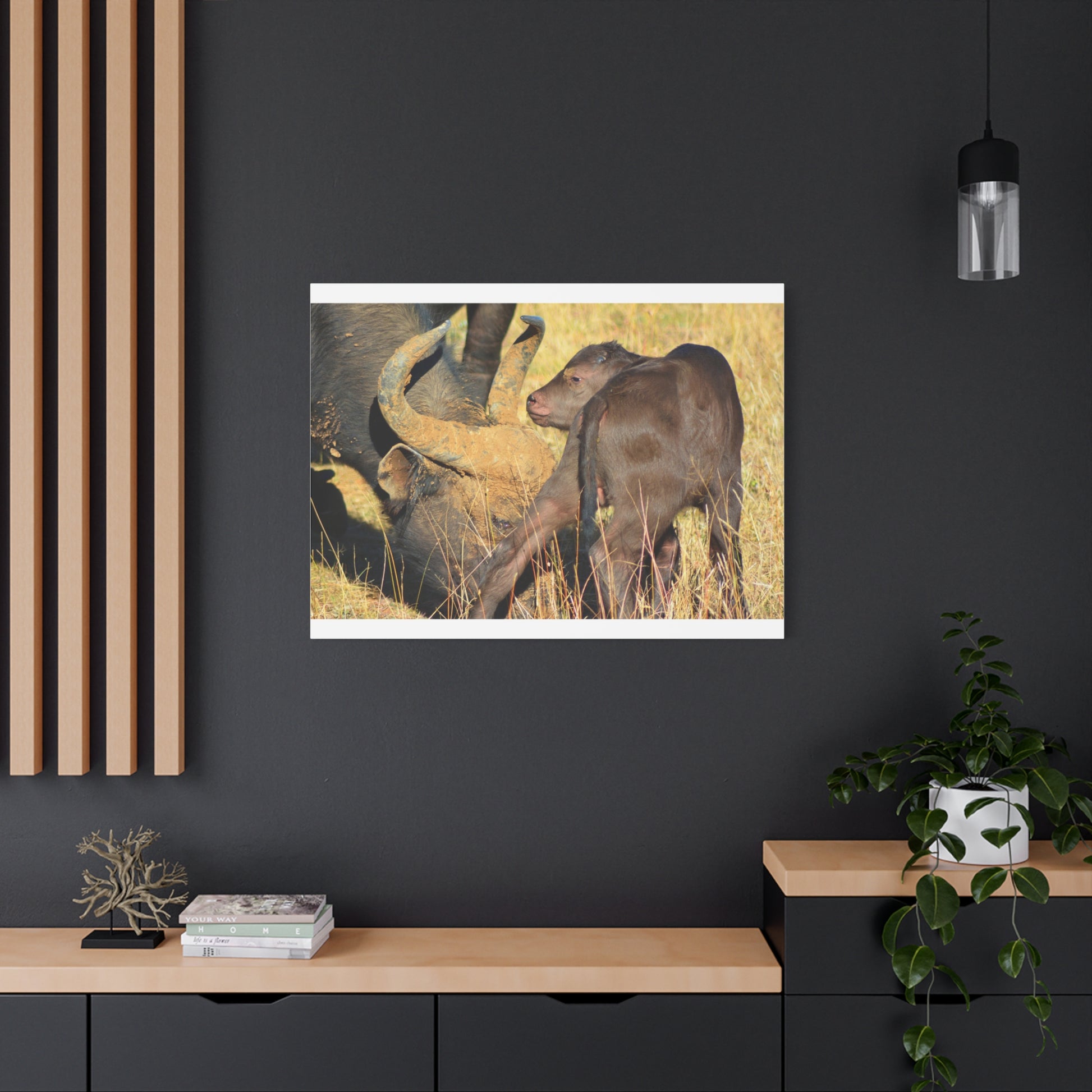 A stunning canvas print featuring a cape buffalo tending to calf, perfect for nature enthusiasts and animal lovers. This artwork brings a sense of the wild into your space, making it ideal for rustic home decor or wildlife-themed rooms. Great gift for wildlife photographers and nature lovers, suitable for birthdays, Mother's Day, and housewarming gifts.