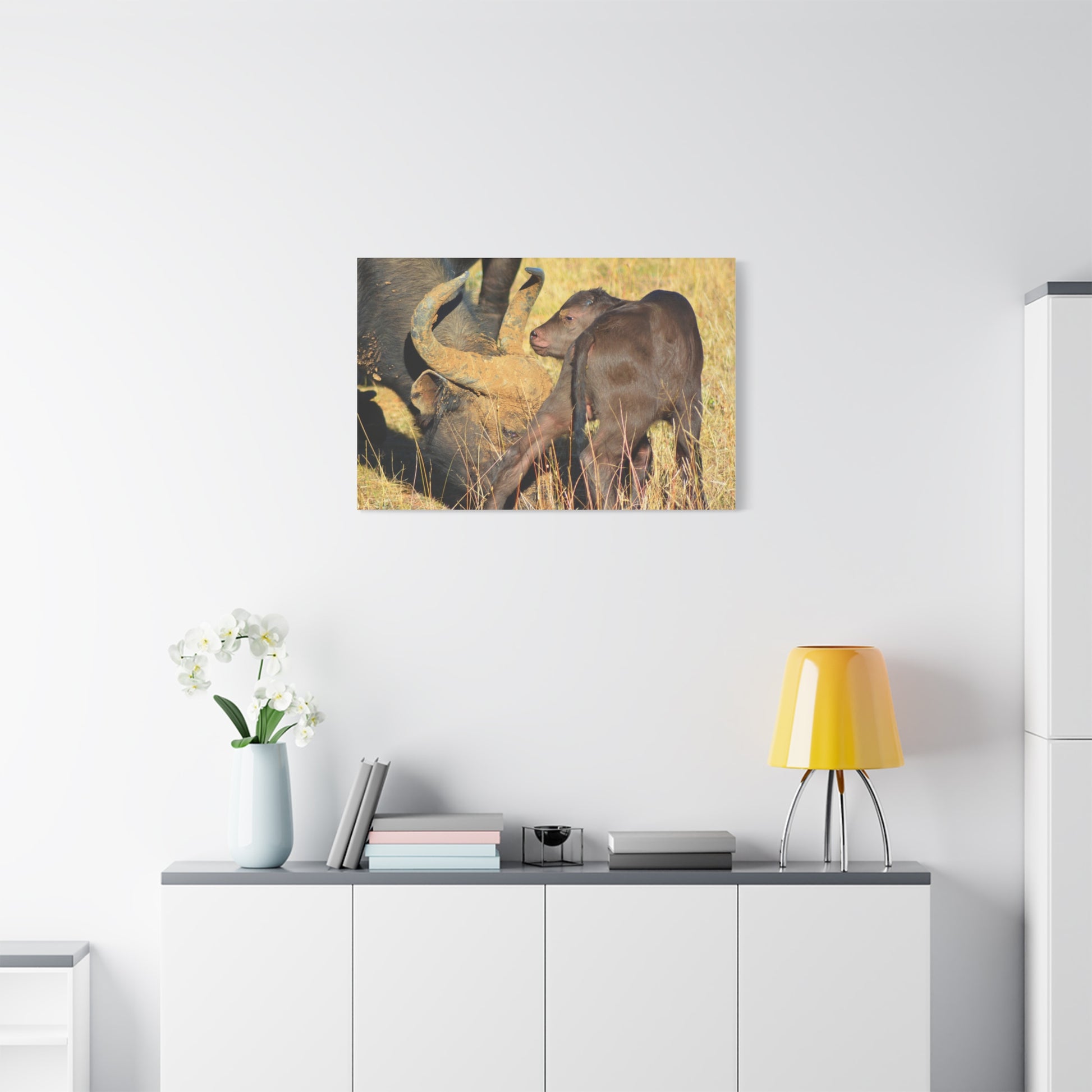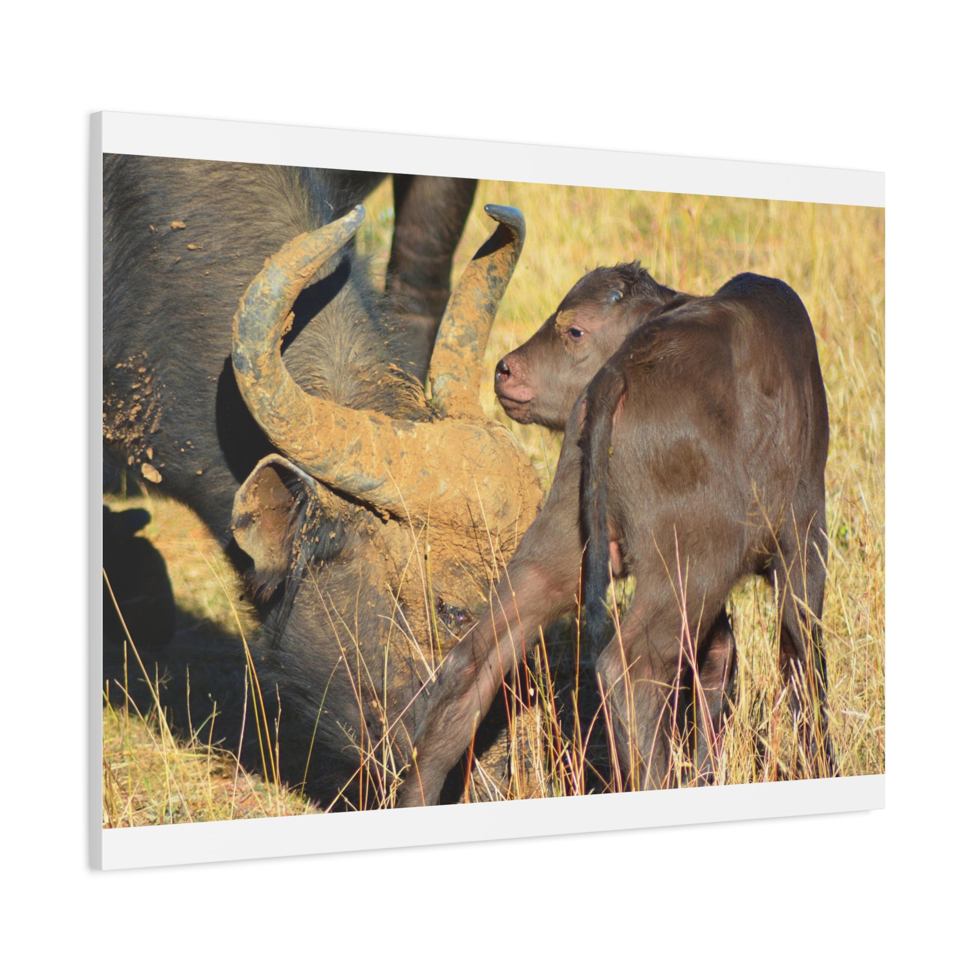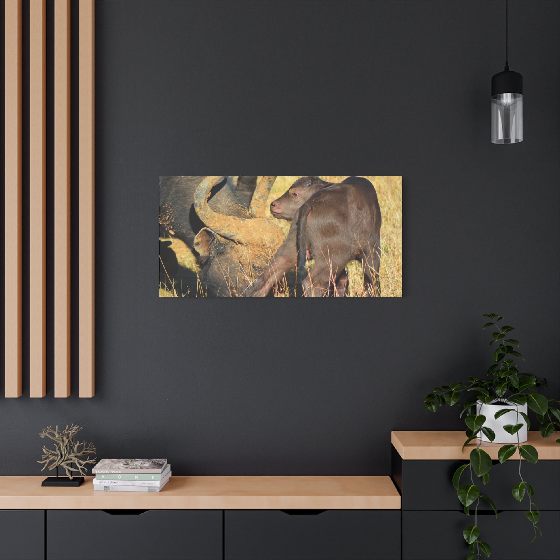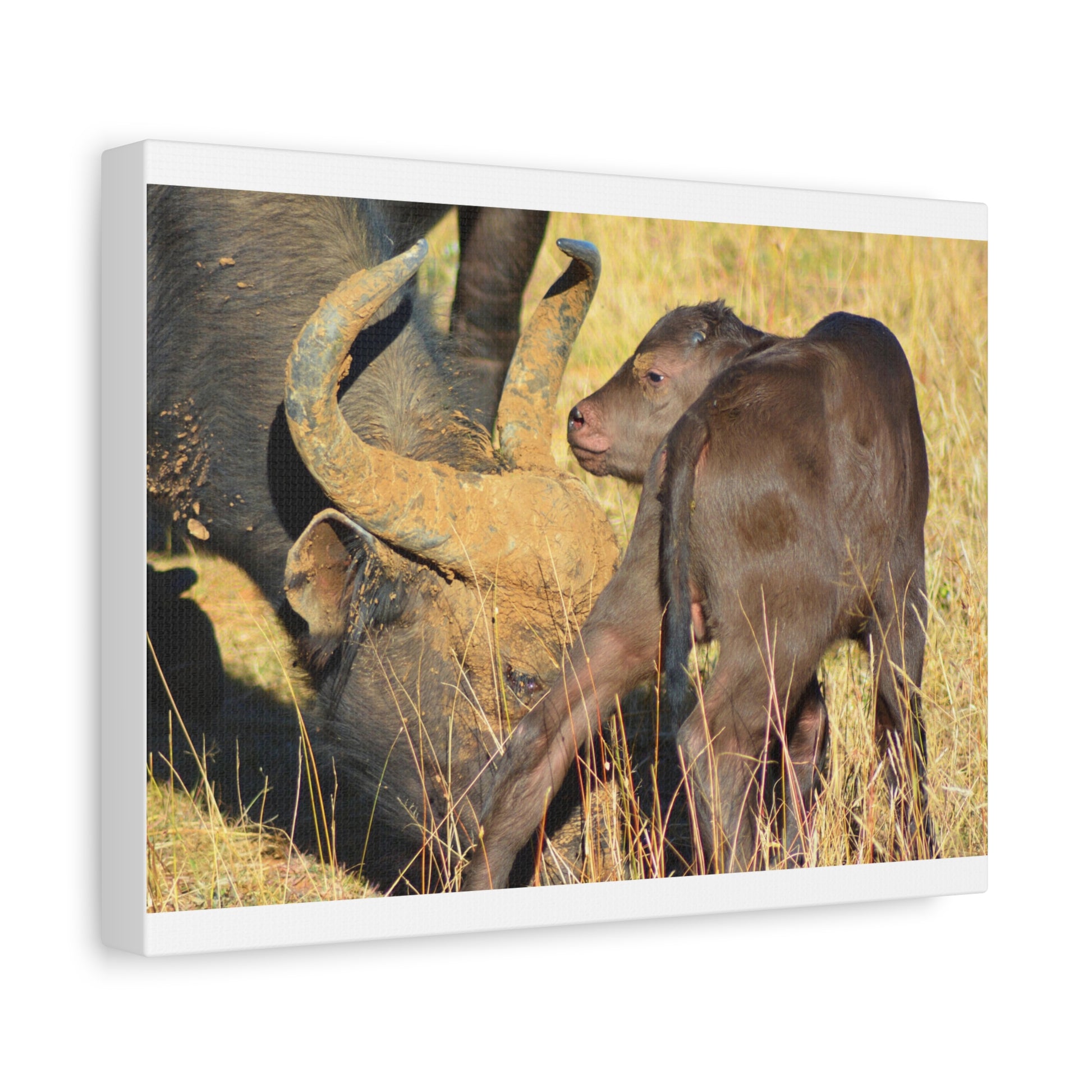 A stunning canvas print featuring a cape buffalo tending to calf, perfect for nature enthusiasts and animal lovers. This artwork brings a sense of the wild into your space, making it ideal for rustic home decor or wildlife-themed rooms. Great gift for wildlife photographers and nature lovers, suitable for birthdays, Mother's Day, and housewarming gifts.