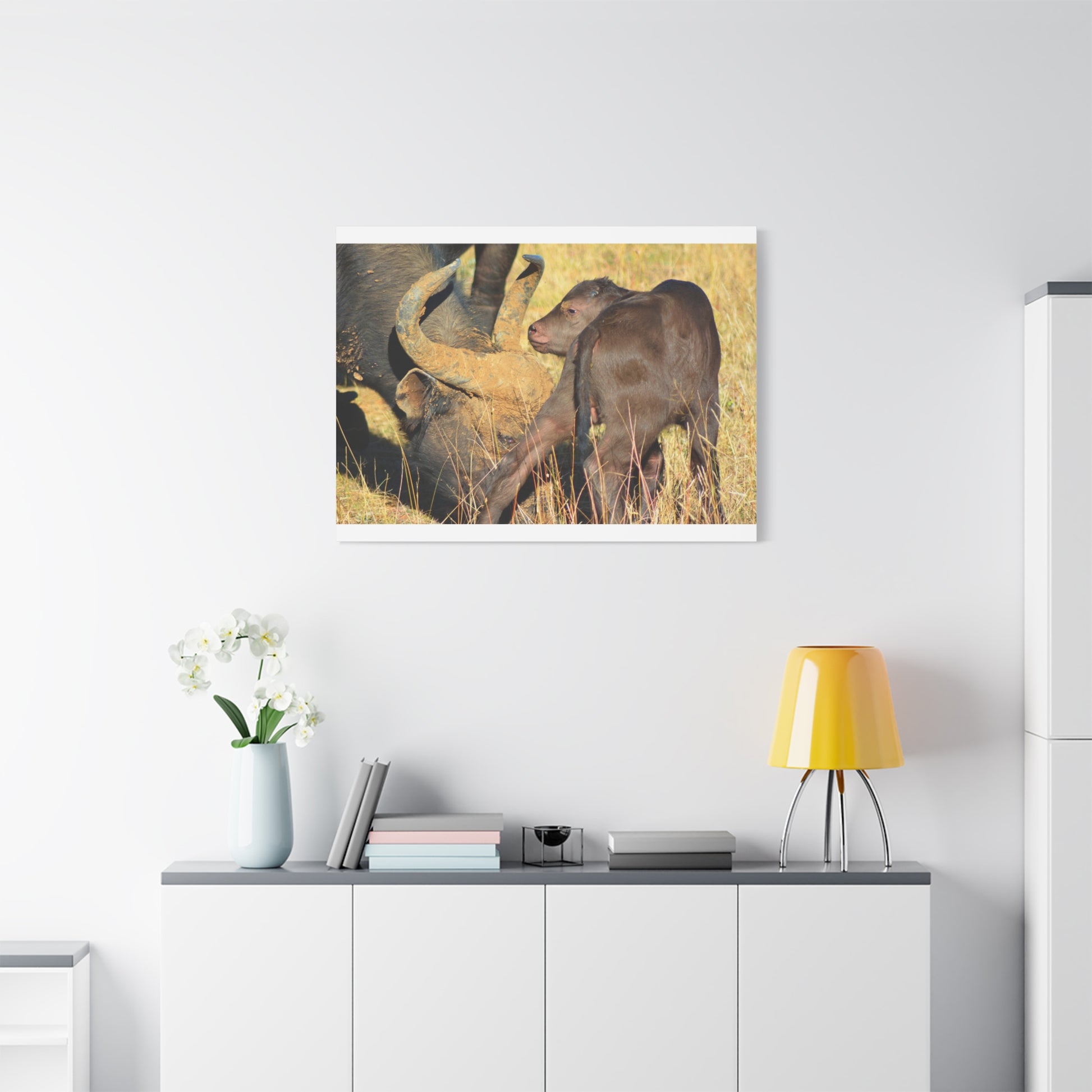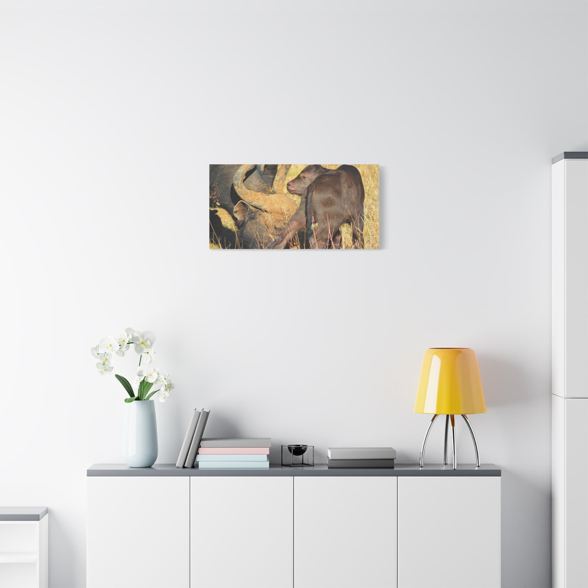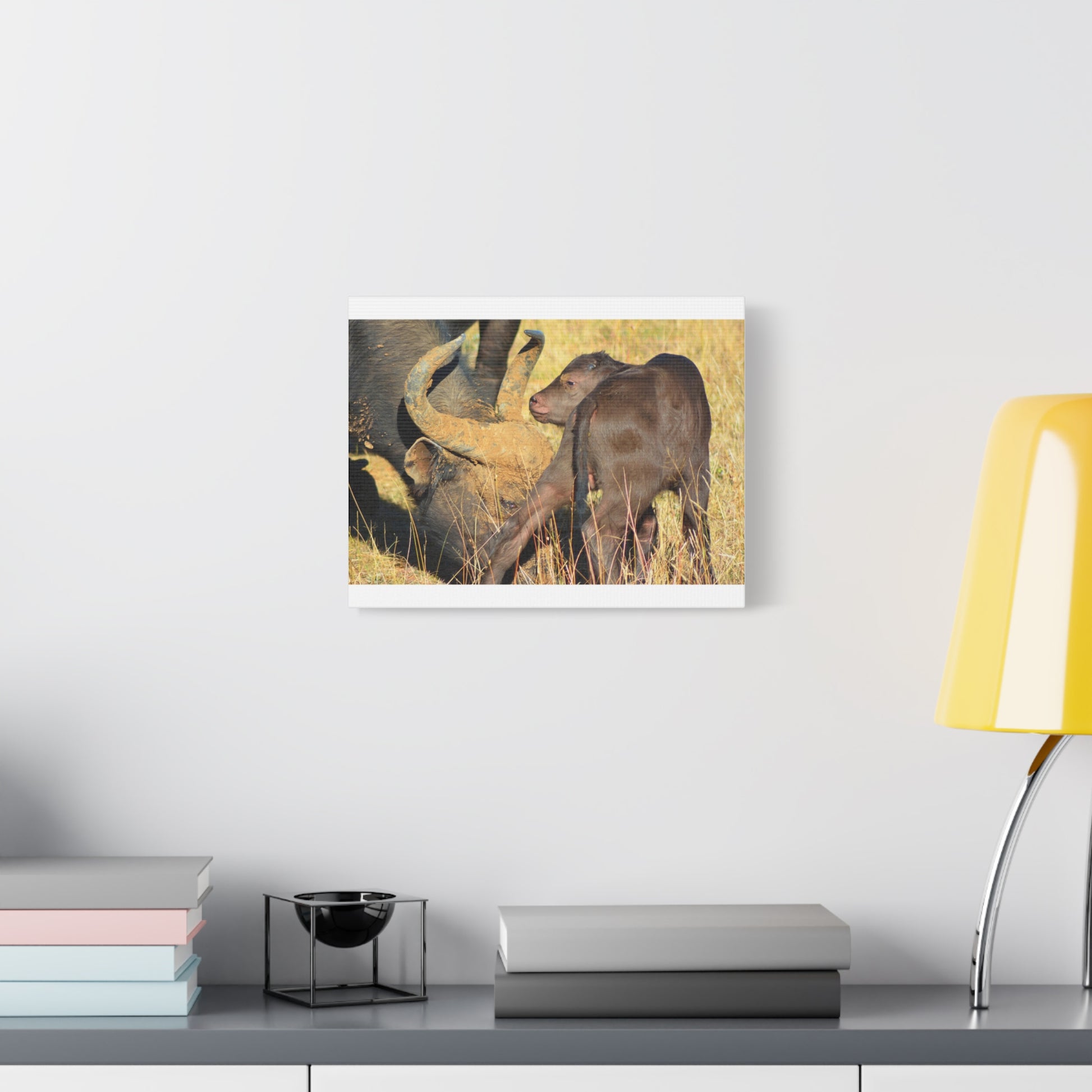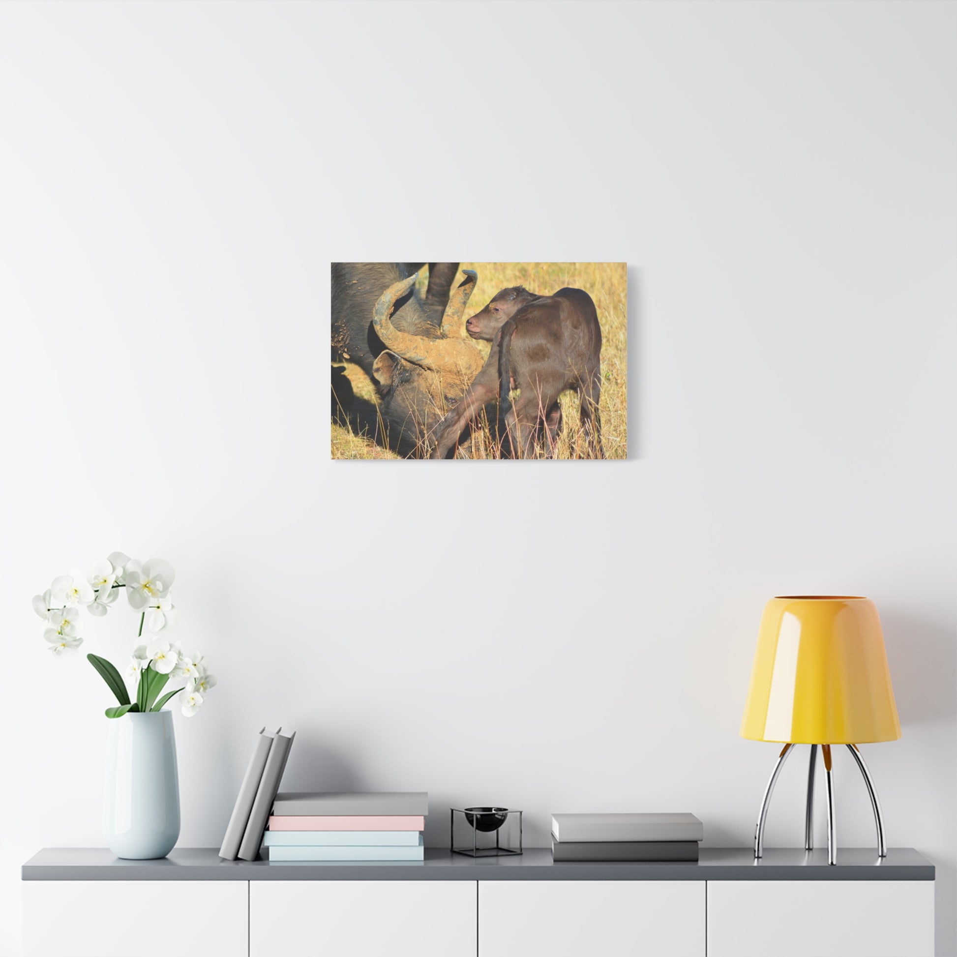 A stunning canvas print featuring a cape buffalo tending to calf, perfect for nature enthusiasts and animal lovers. This artwork brings a sense of the wild into your space, making it ideal for rustic home decor or wildlife-themed rooms. Great gift for wildlife photographers and nature lovers, suitable for birthdays, Mother's Day, and housewarming gifts.