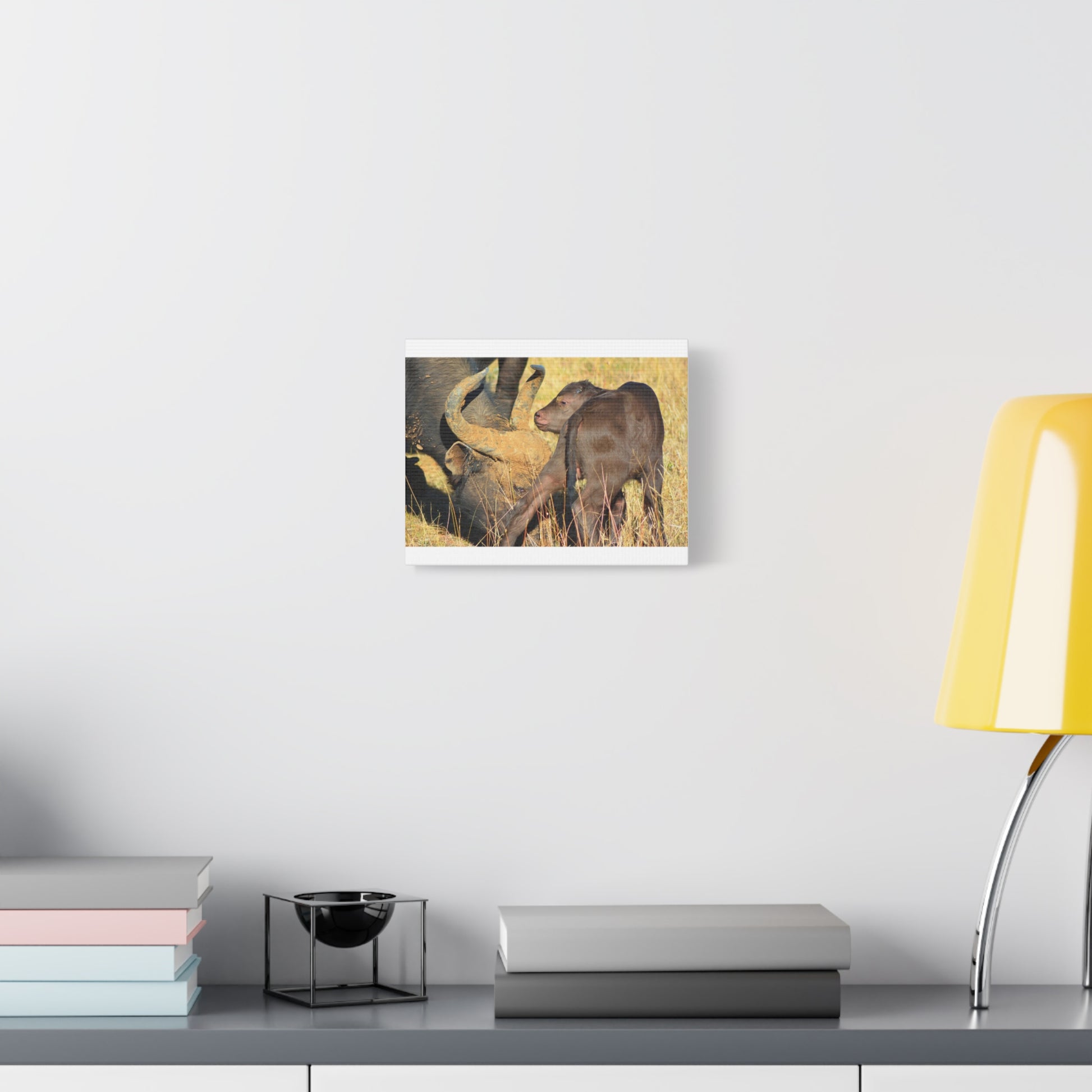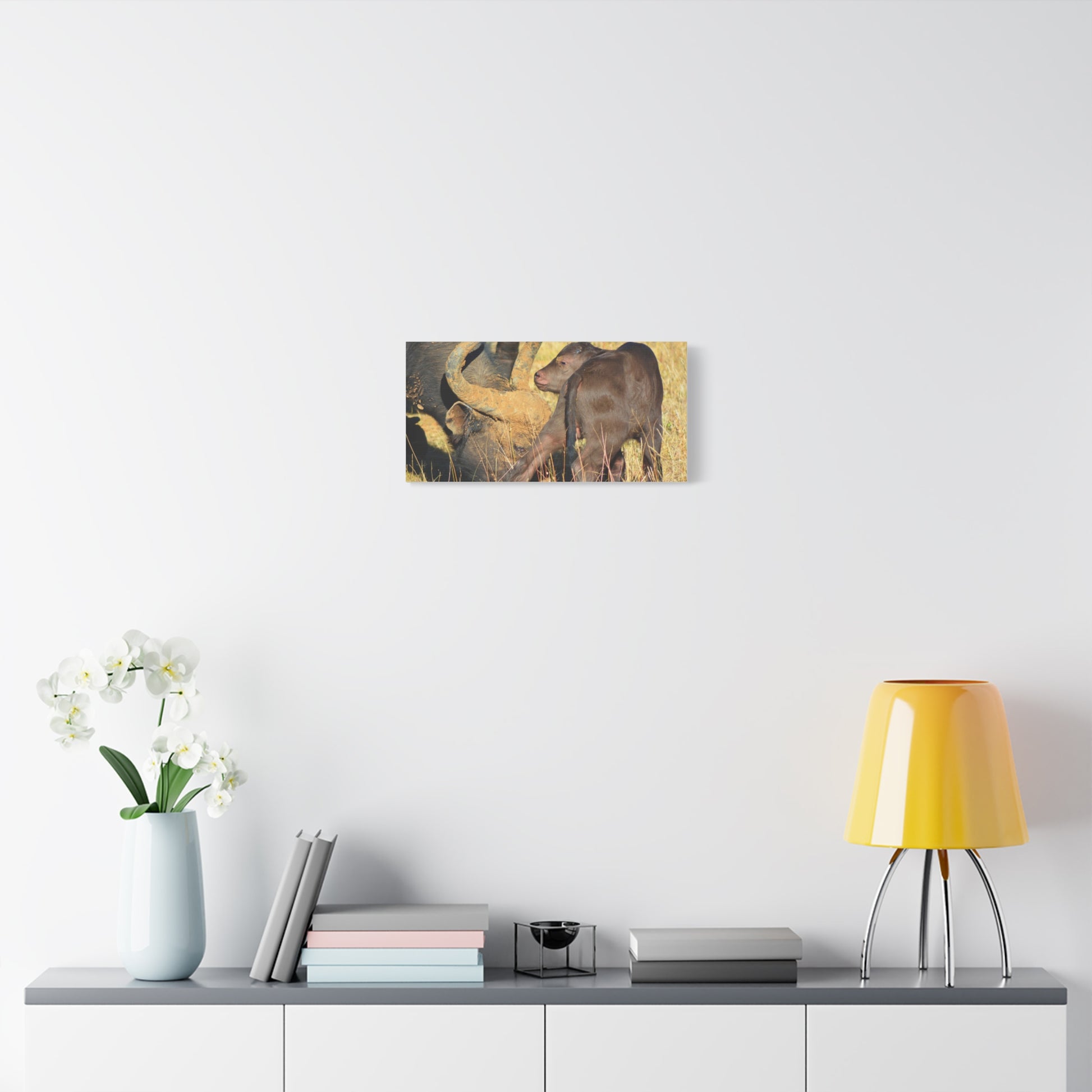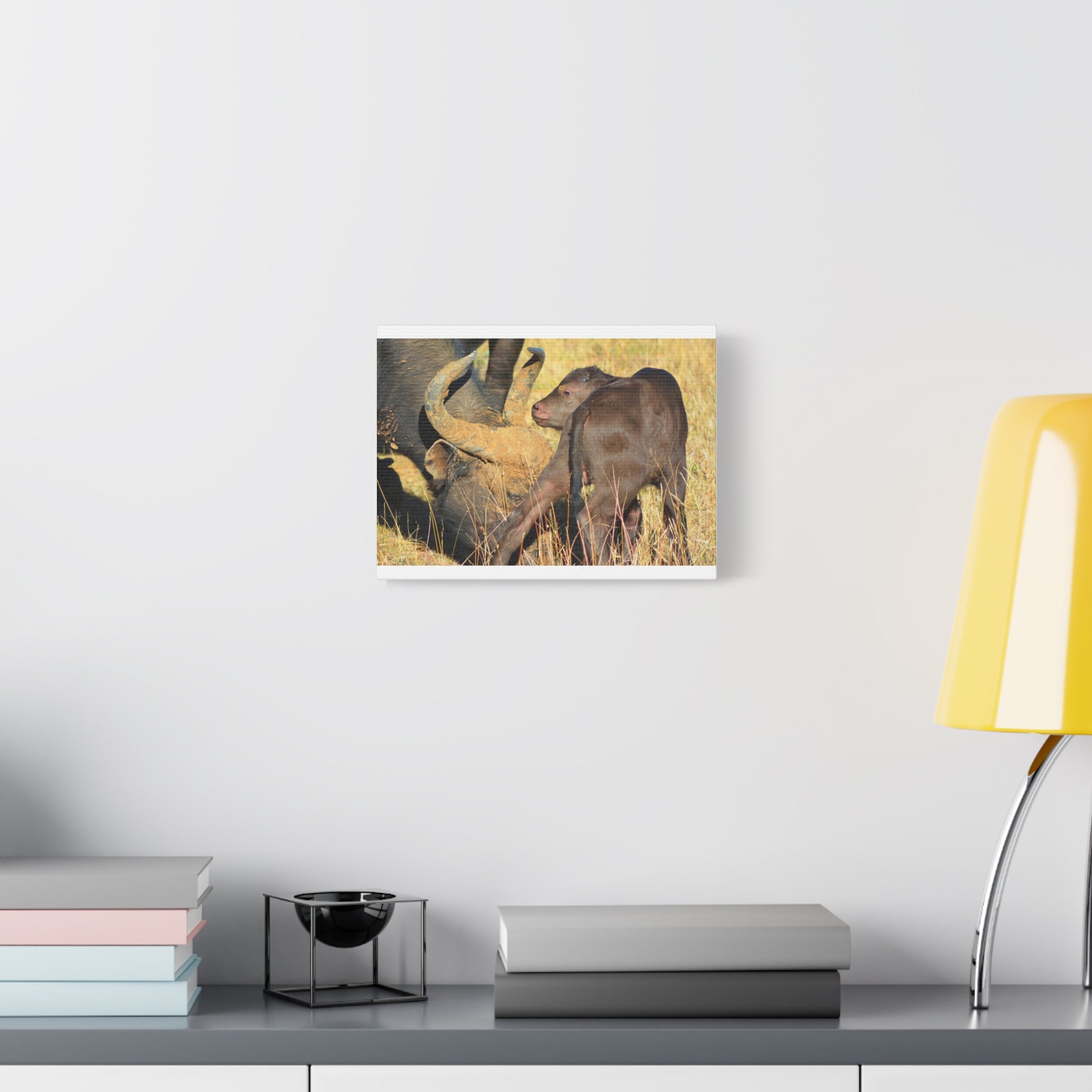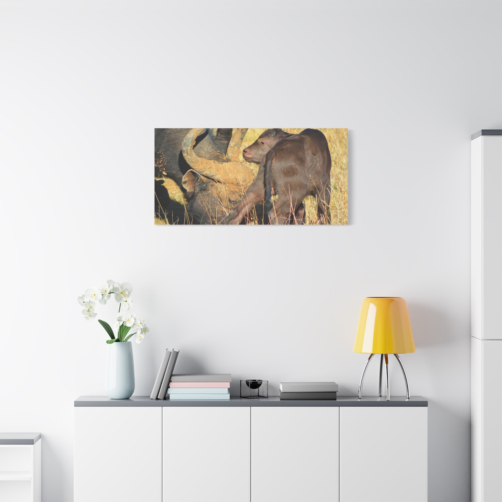 A stunning canvas print featuring a cape buffalo tending to calf, perfect for nature enthusiasts and animal lovers. This artwork brings a sense of the wild into your space, making it ideal for rustic home decor or wildlife-themed rooms. Great gift for wildlife photographers and nature lovers, suitable for birthdays, Mother's Day, and housewarming gifts.