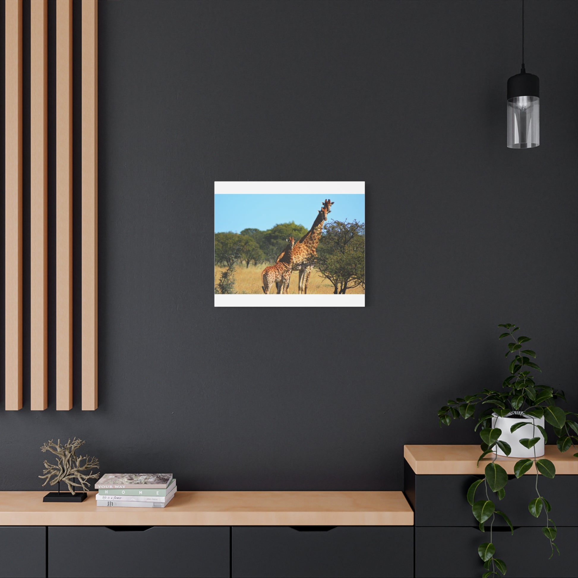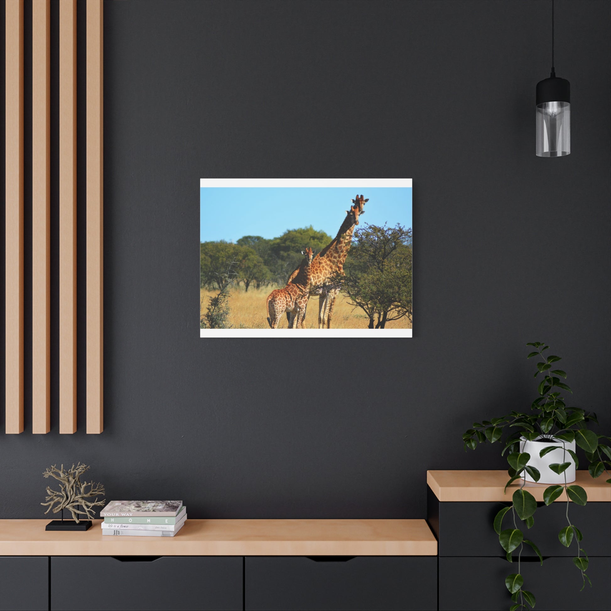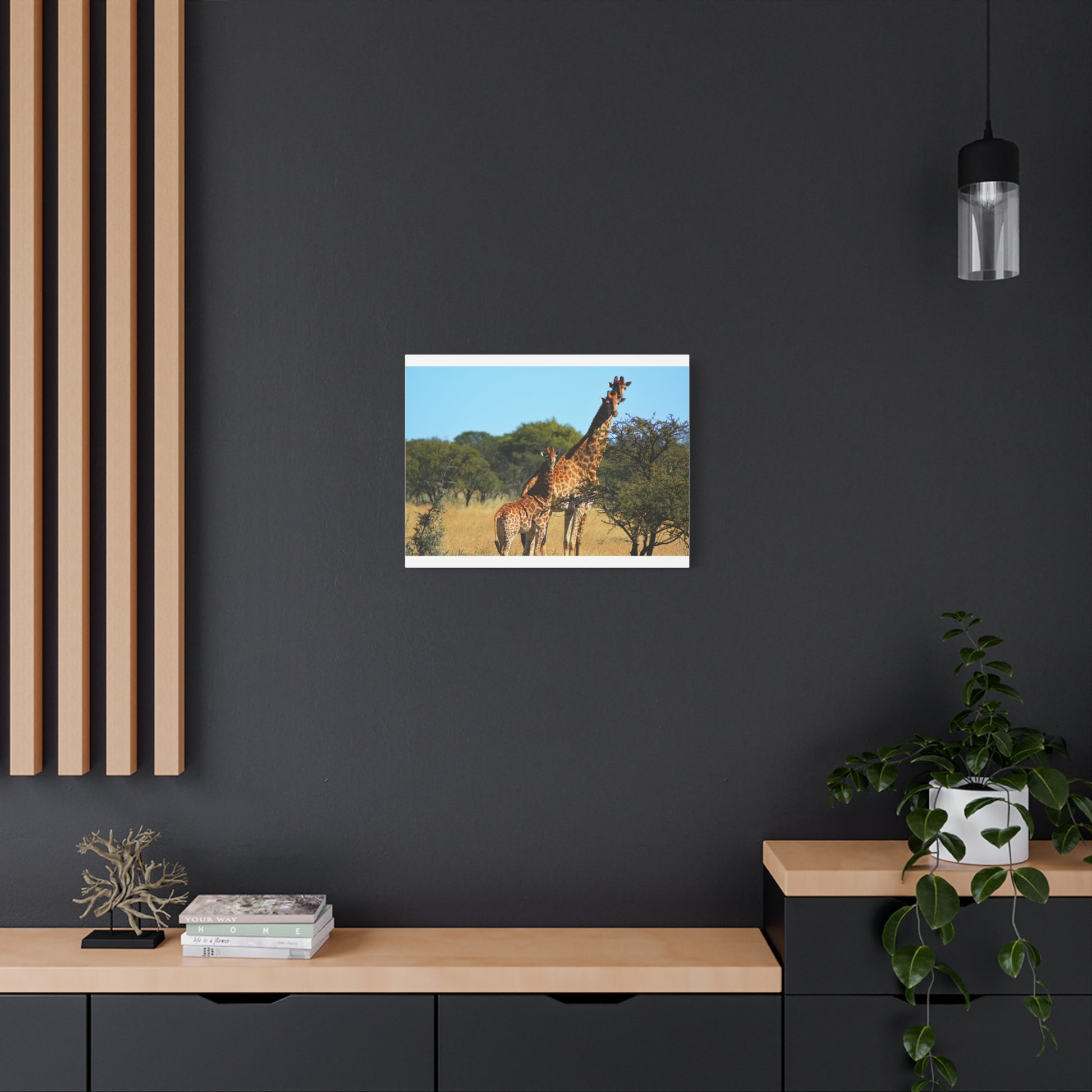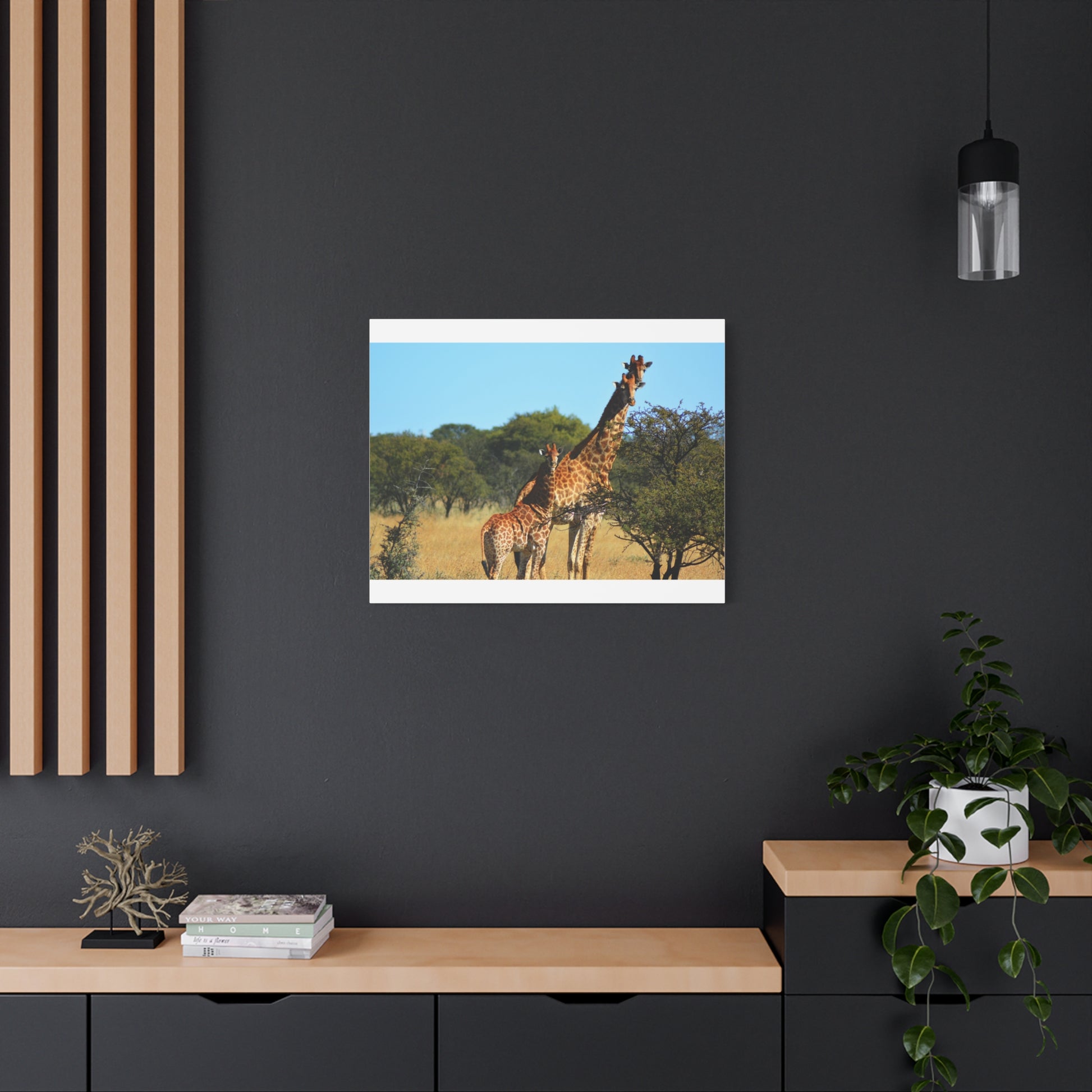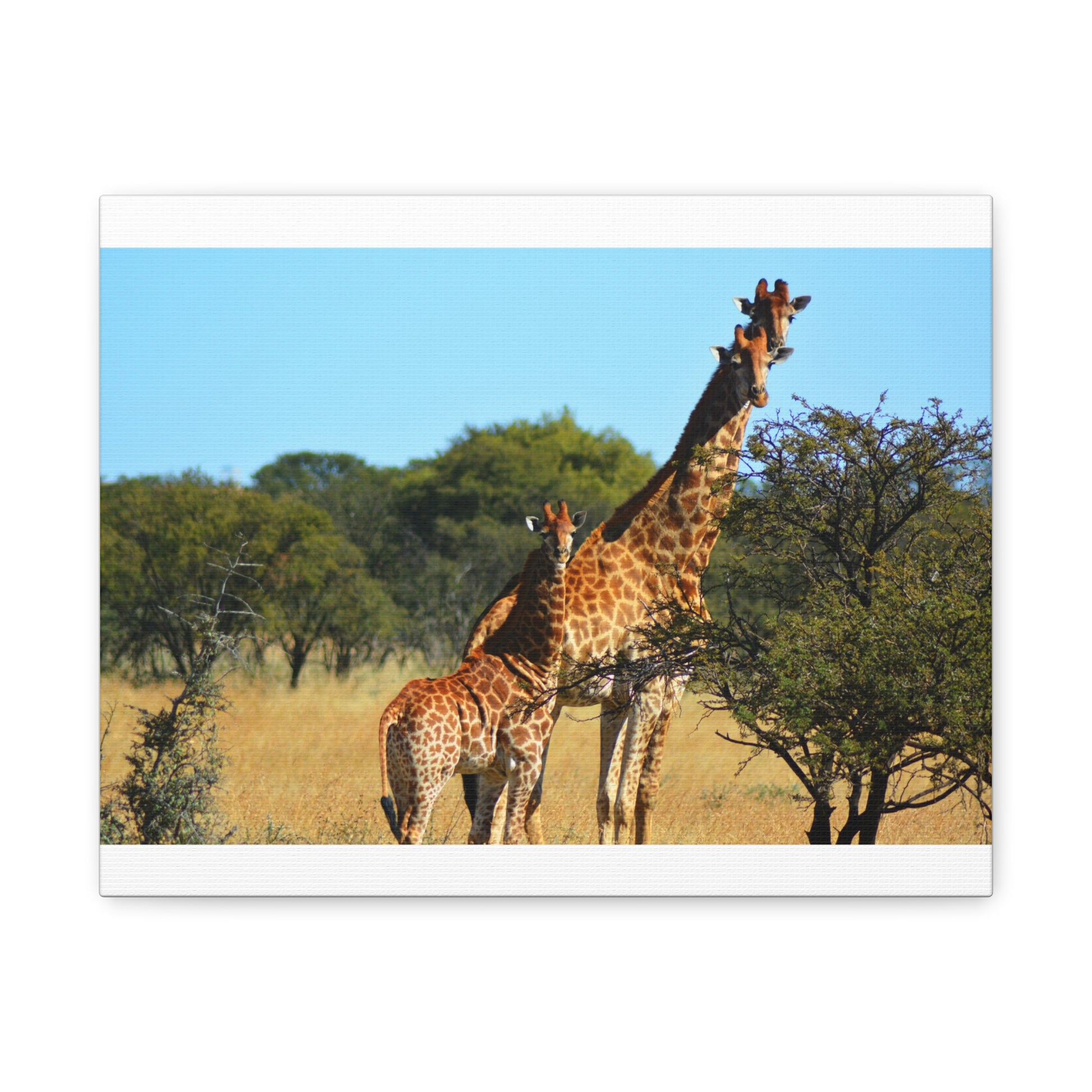 Bring the beauty of the African savanna into your home with this stunning Canvas Print featuring a Giraffe Family. Perfect for animal lovers and those seeking a touch of nature in their decor. Ideal for gifting on birthdays, Mother's Day, and housewarmings.