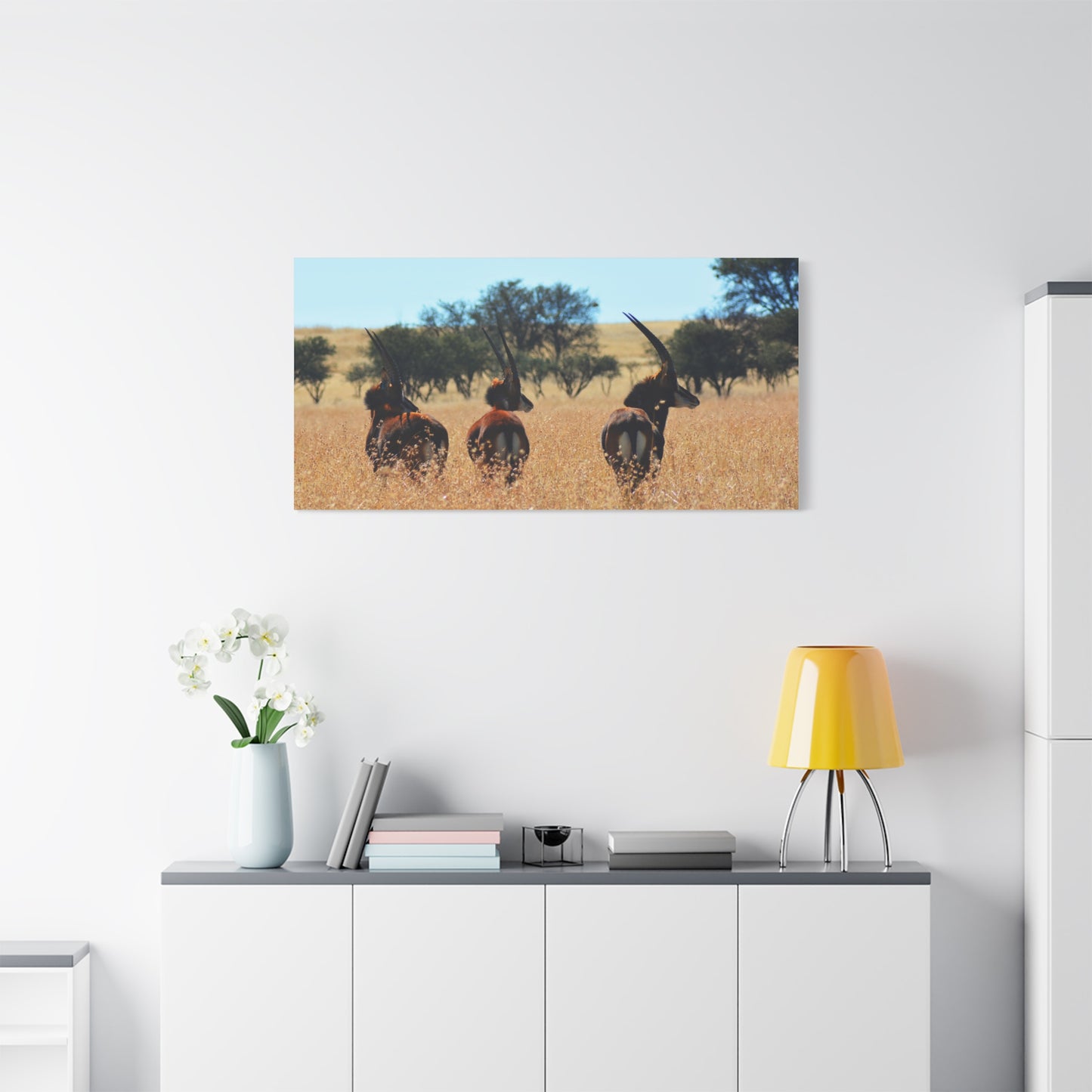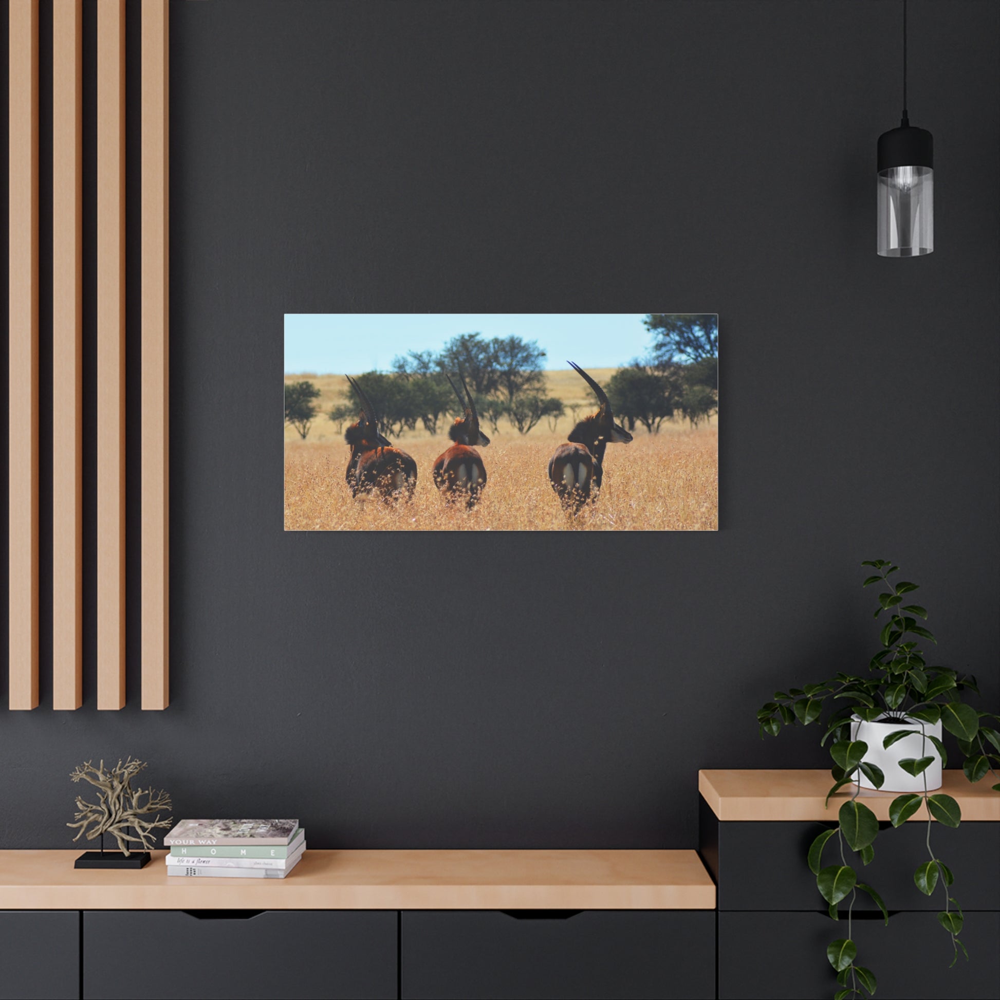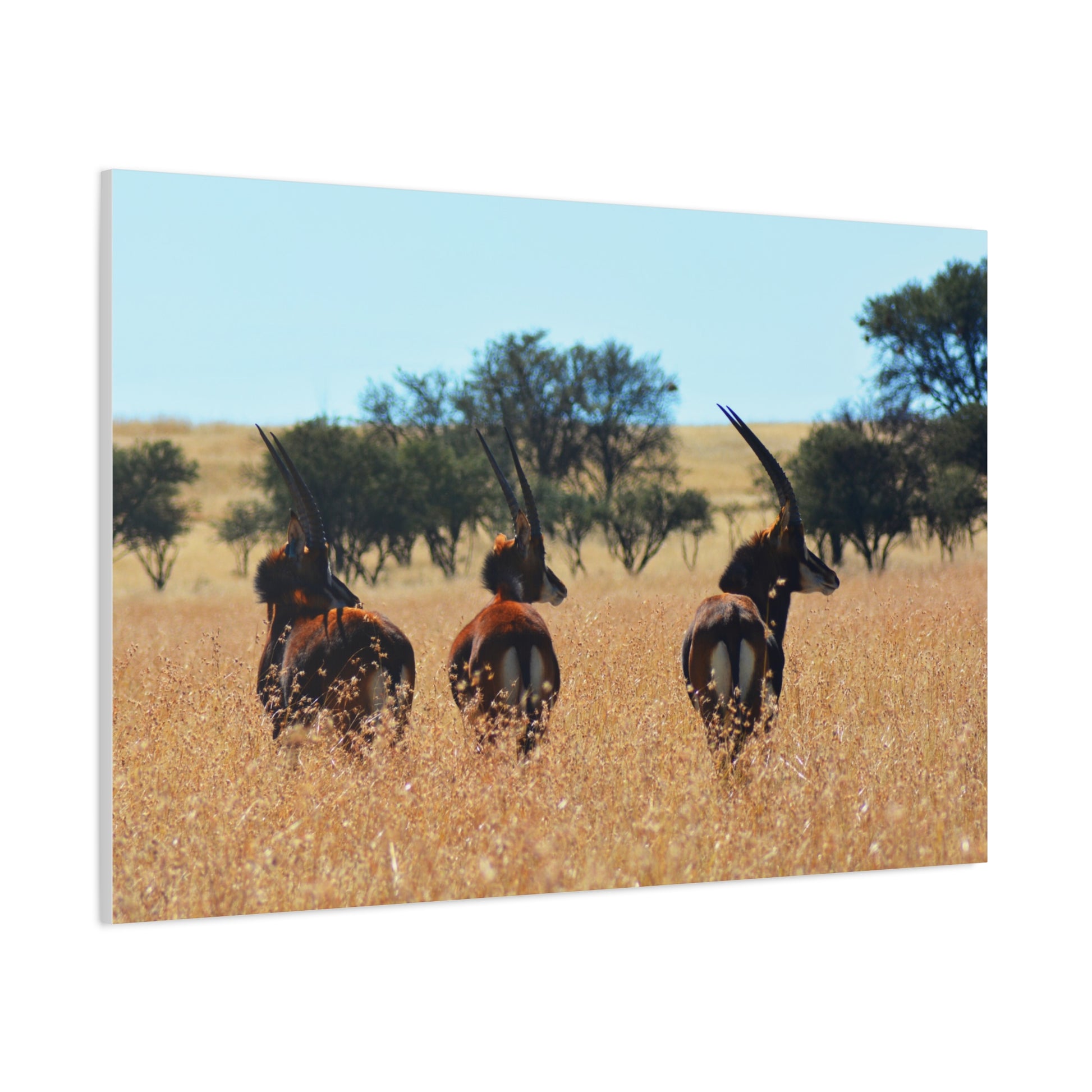 A stunning sable trio in Africa design printed on a matte canvas and stretched on a 1.25" frame. This canvas print exudes a wild and adventurous vibe, making it perfect for nature lovers and those who appreciate African wildlife. Ideal for decorating living rooms, offices, or bedrooms. Perfect for gifting on birthdays, holidays, or housewarming parties.