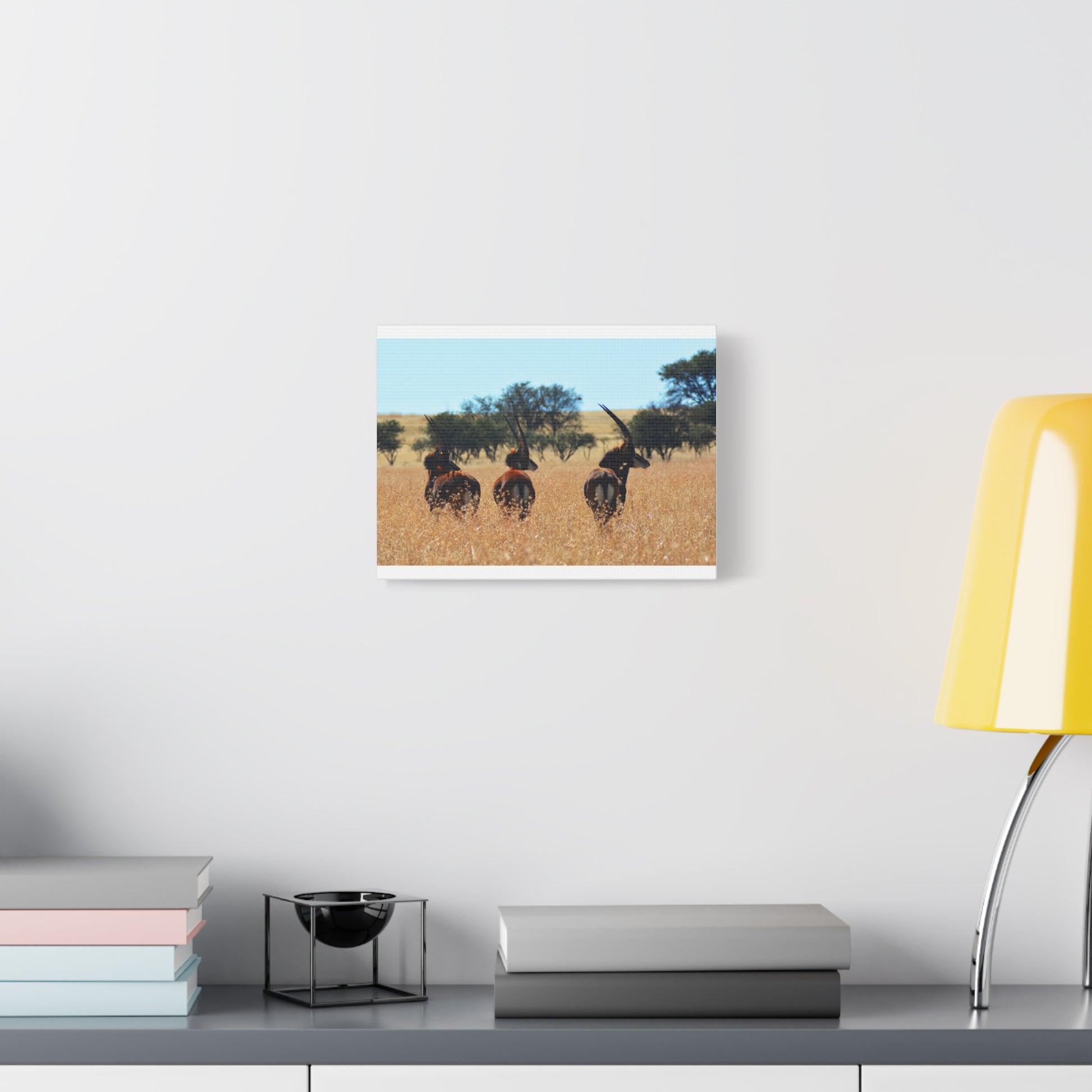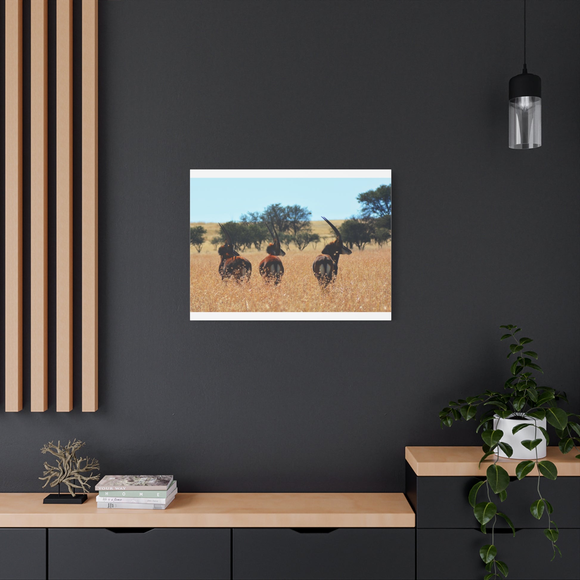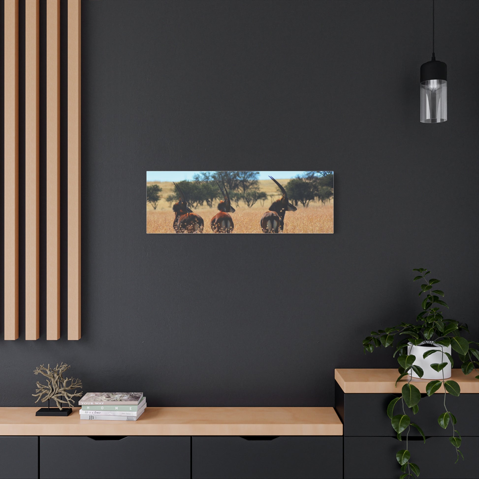 A stunning sable trio in Africa design printed on a matte canvas and stretched on a 1.25" frame. This canvas print exudes a wild and adventurous vibe, making it perfect for nature lovers and those who appreciate African wildlife. Ideal for decorating living rooms, offices, or bedrooms. Perfect for gifting on birthdays, holidays, or housewarming parties.